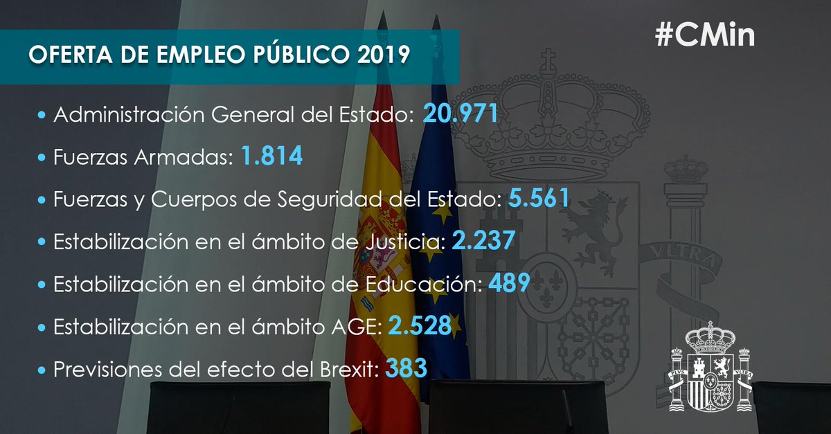 El Consejo de Ministros ha aprobado la Oferta de Empleo Público para 2019 que sumará un total de 33.793 plazas, 2.949 más (casi un 10%) que la oferta de 2018 y la mayor de los últimos 11 años.